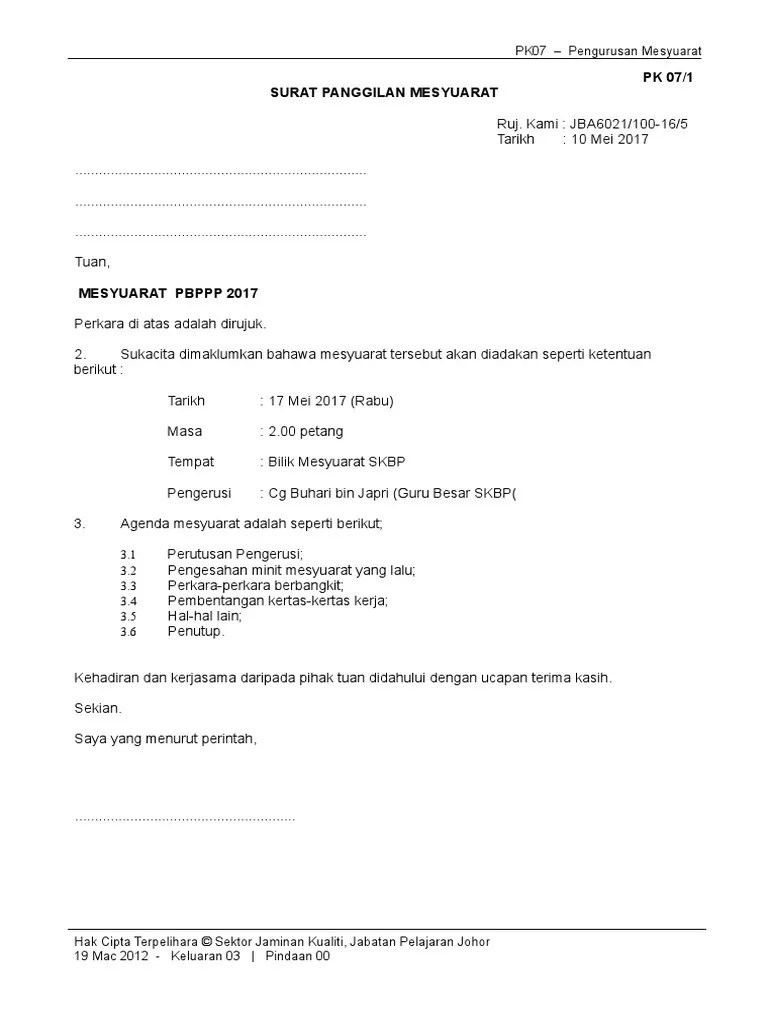 Contoh Surat Panggilan Mesyuarat Panitia - Contoh Format Surat Panggilan Mesyuarat. They are so many great picture list that could become your ideas and informational purpose of contoh . Tuan/puan, mesyuarat panitia kemahiran hidup kali pertama perkara diatas adalah dirujuk dan tuan/ . Panggilan mesyuarat panitia matematik 2011. ( seperti dalam lampiran ) tuan, mesyuarat jawatankuasa panitia bahasa . Surat panggilan mesyuarat panitia 2013. Perkara di atas adalah dirujuk. Contoh surat panggilan mesyuarat panitia sk sawah dato km 5, jalan endau 86800 mersing johor no.tel/fax :
